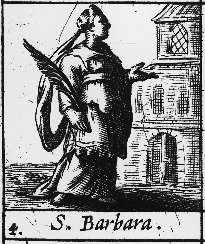 Barbara, afgebeeld met palmtak in haar rechterhand. Zij wendt zich naar de toren waarin zij door haar vader werd opgesloten. Afbeelding bij de maand december in Ribadineira en Rosweydus,