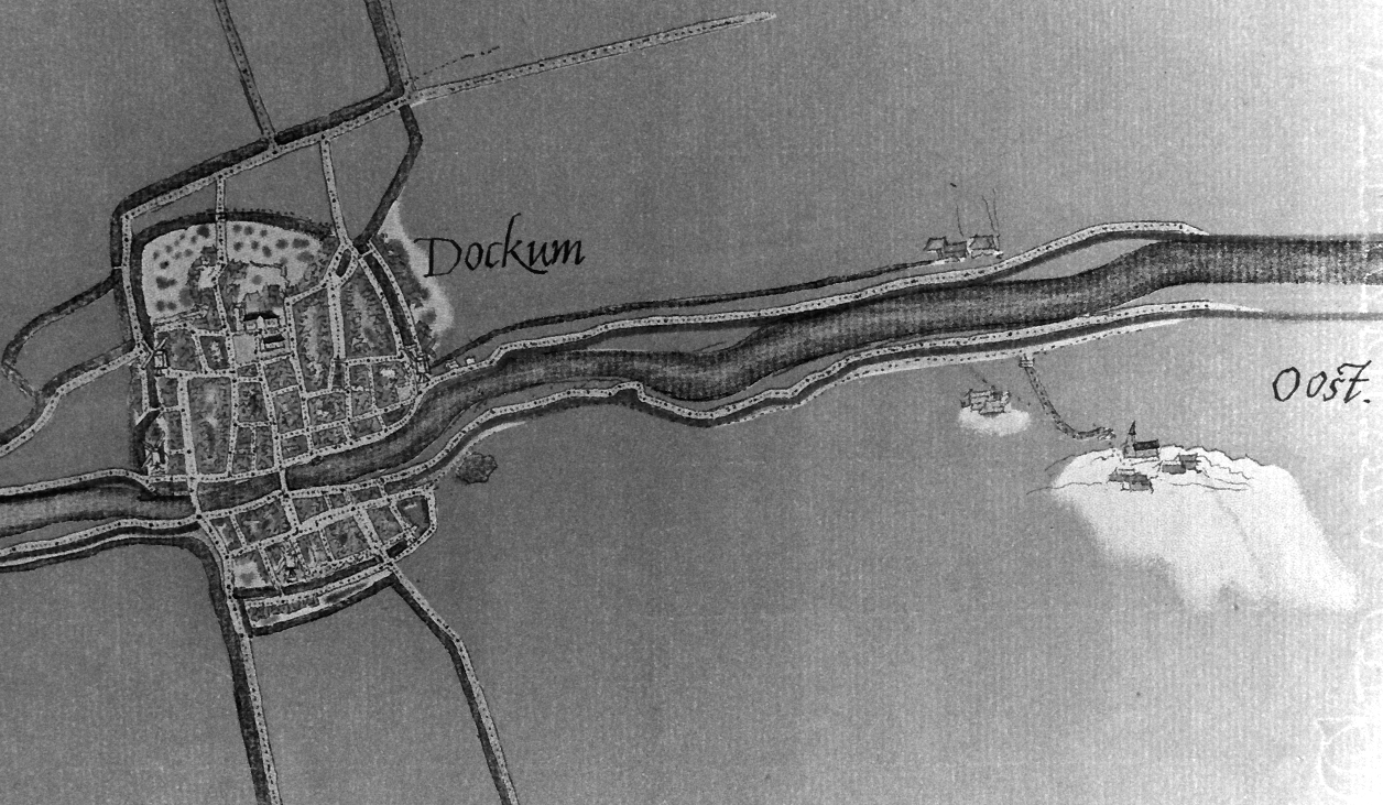 Topografische kaart van Dokkum en omgeving door Jacob van Deventer uit 1562. Rechts op de kaart, ten zuiden van de Dokkumer Ee, is tezamen met enkele huizen de Mariakapel afgebeeld. Uit Fruin,