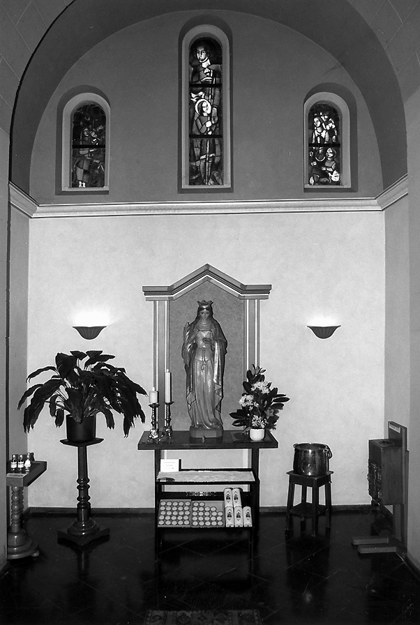 Het Odiliabeeld in de nieuwe Odiliakapel (1997) in de parochiekerk van Nieuwenhagen; links staan op een tafeltje flesjes met Odiliawater voor vereerders. Foto A. Jacobs.
