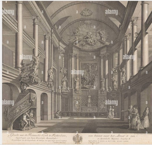 Interieur van de Rosaliakerk in Rotterdam."Print maker: Nicolas Ransonnette, after drawing by: Cornelis van Hardenbergh, publisher: Jacobus Bronkhorst, print maker: Paris, publisher: Rotterdam, in or after 1781."