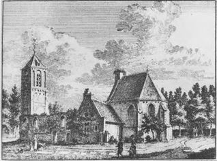 De deels ingestorte kerk en toren van Hagestein in de 18e eeuw.Gravure van H. Spilman nar Jan de Beijer.