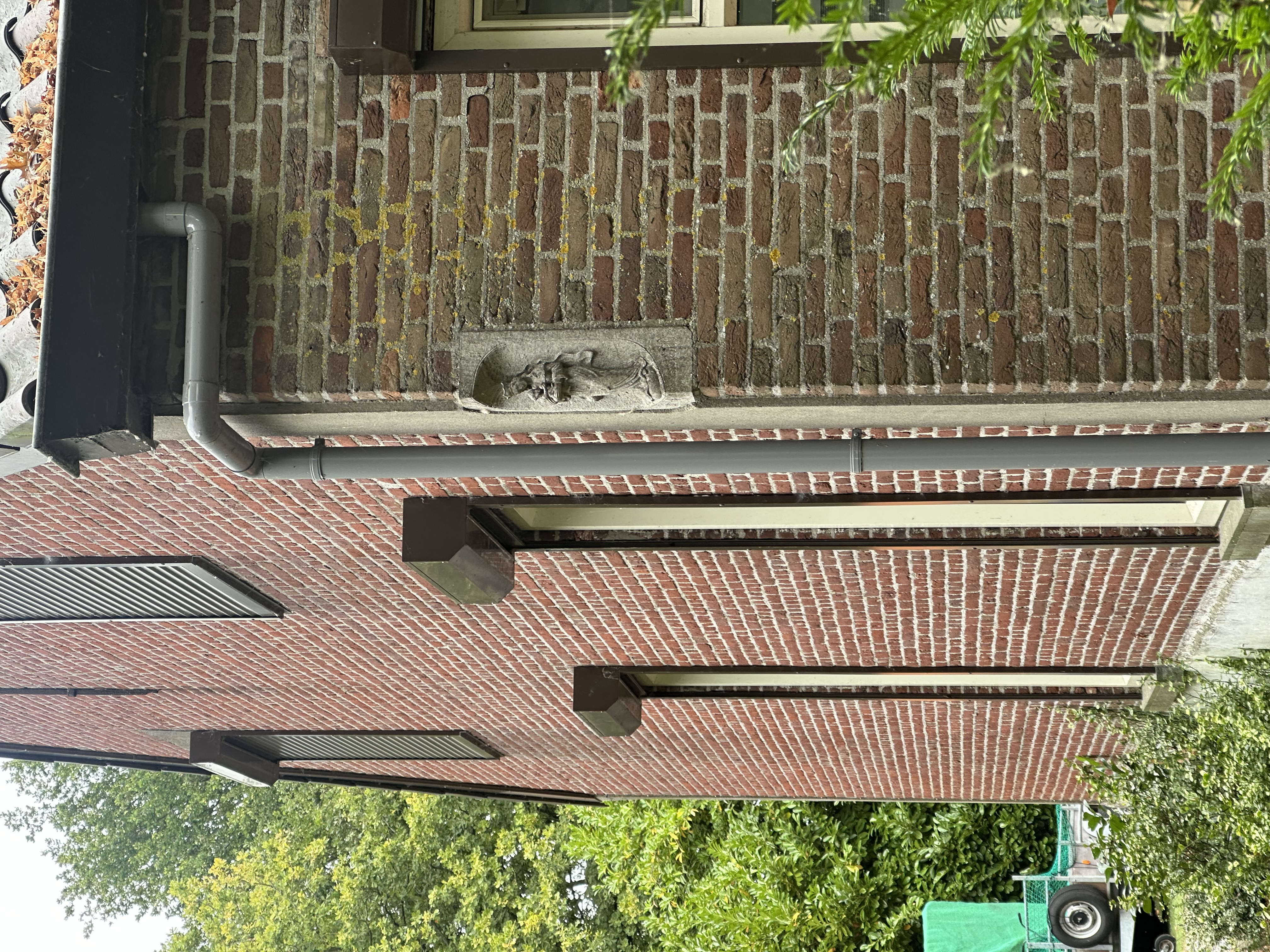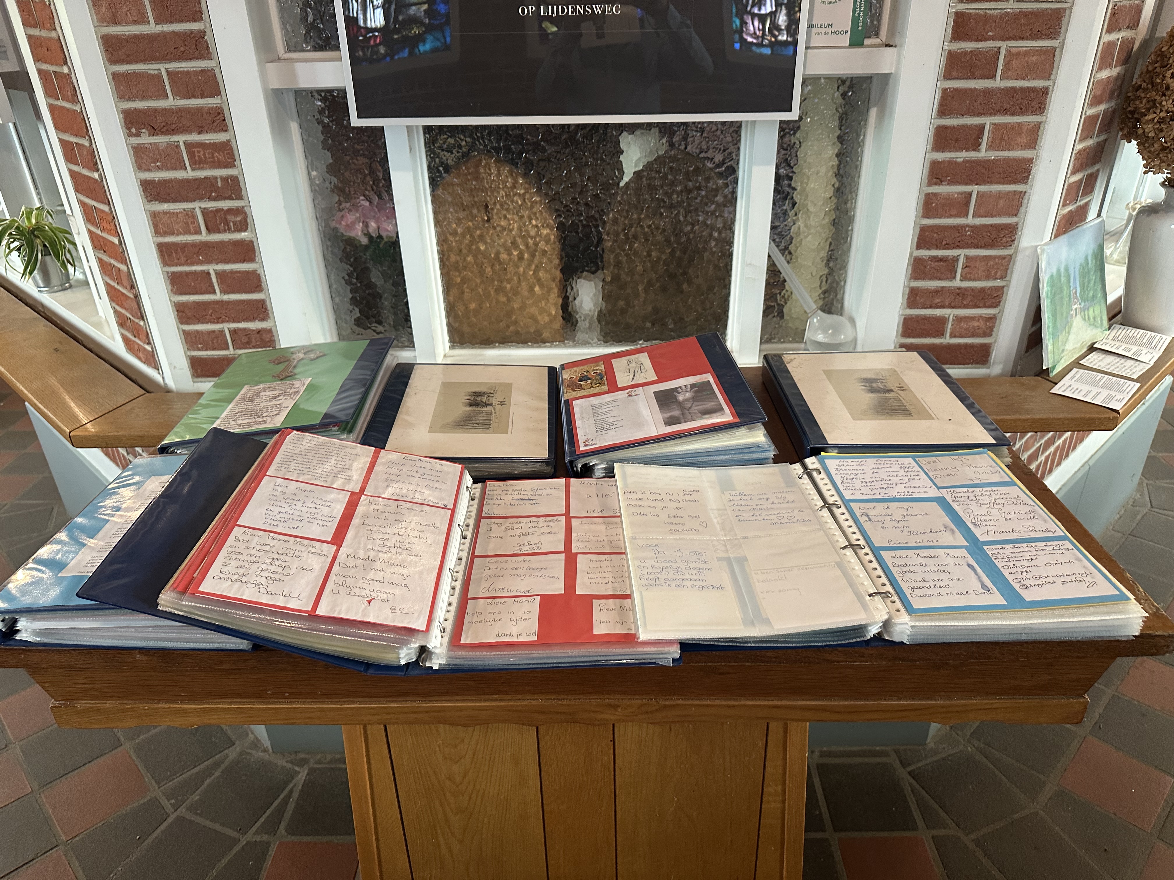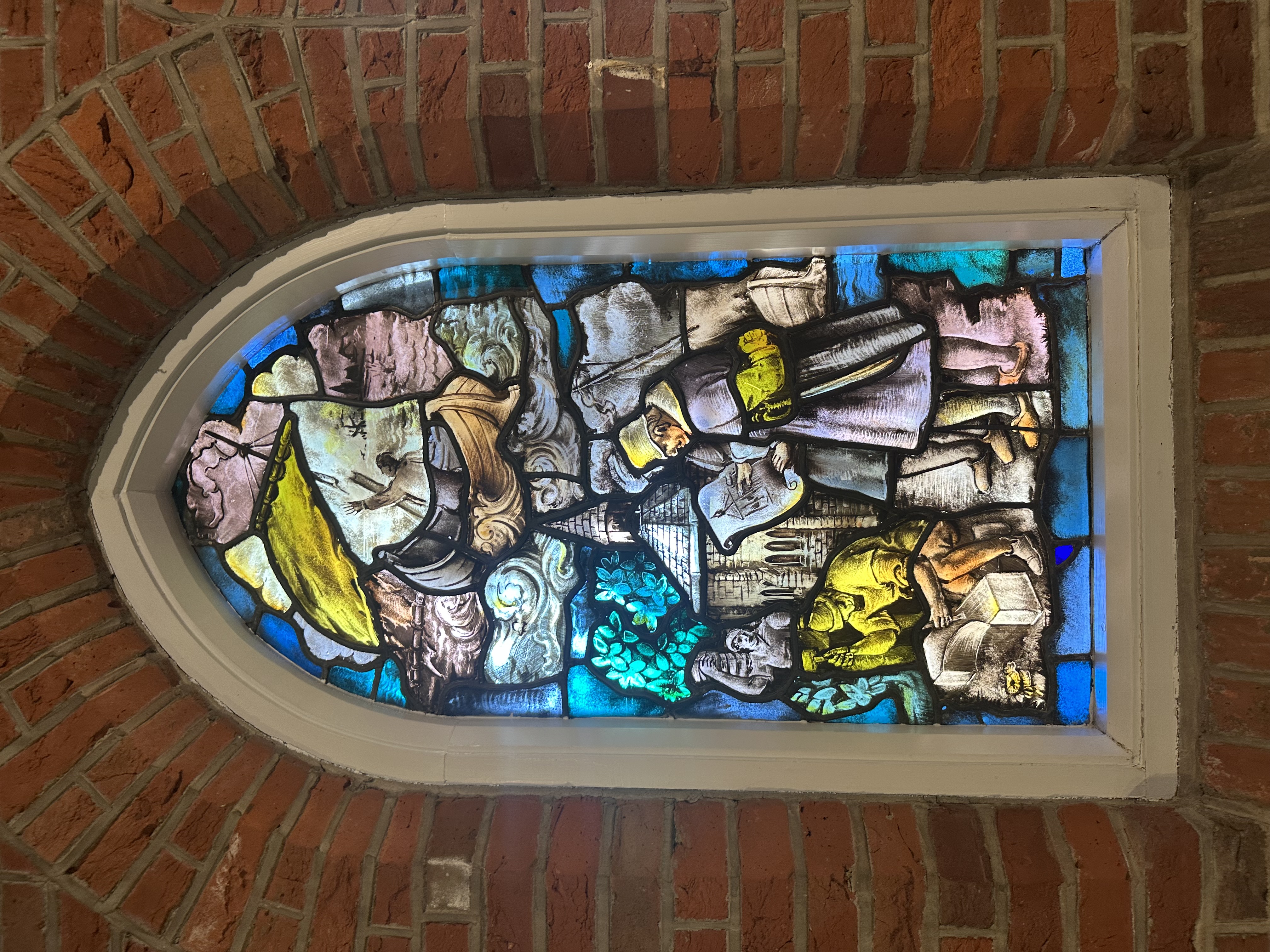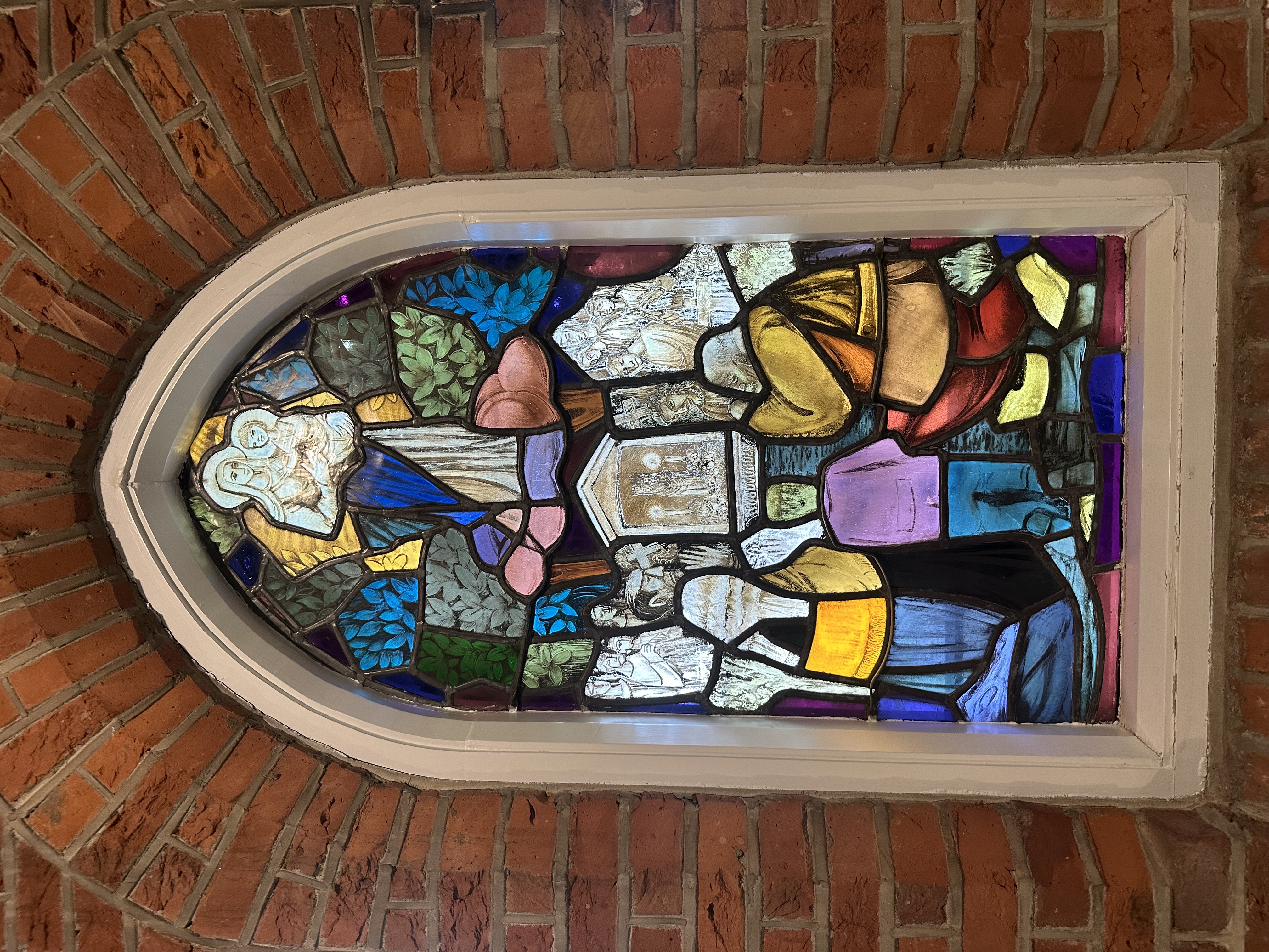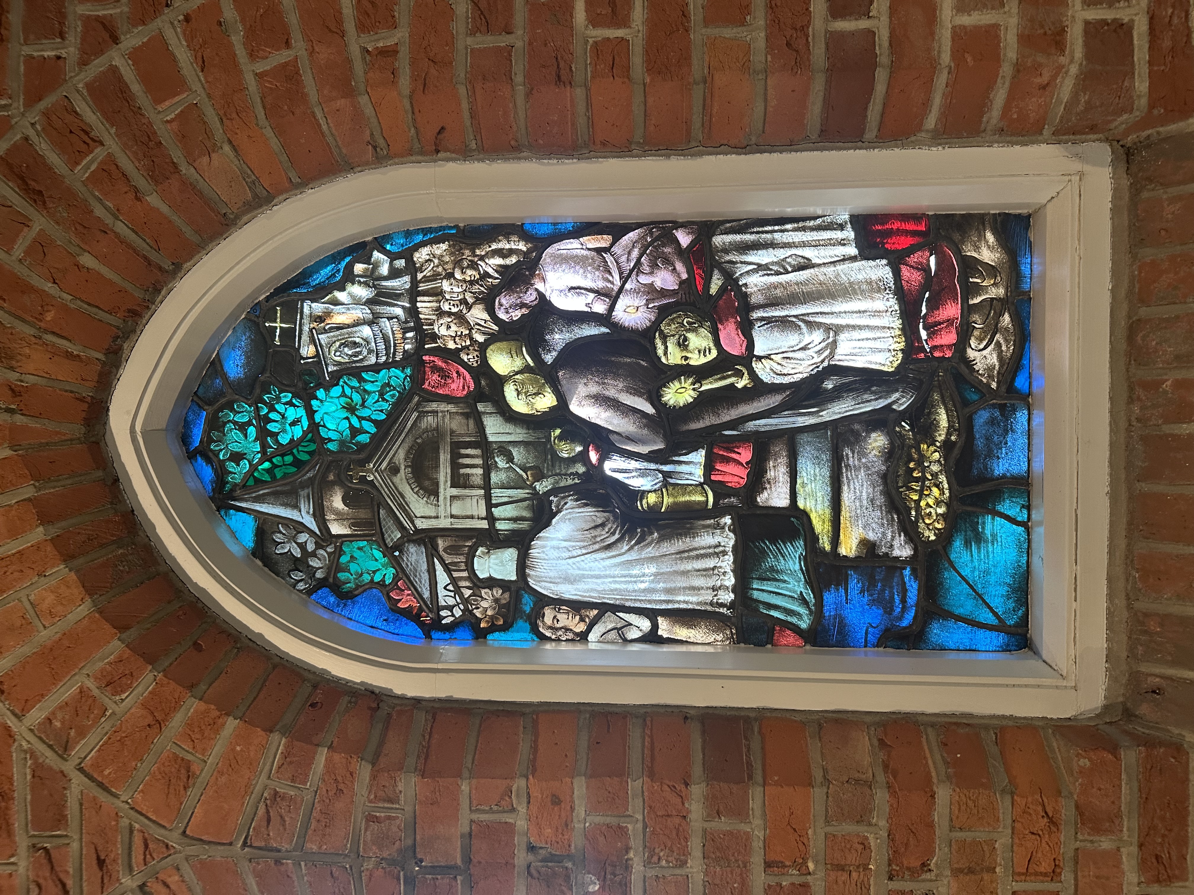 Een van de drie glas-in-loodramen achter het Maria-altaar met de geschiedenis van de Kapelberg zien, deel 2: het Kapelbergterrein vóór 1896, voor de bouw van de huidige kapel. Foto PJM