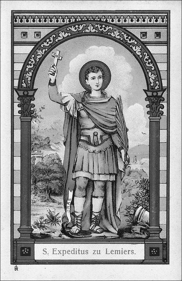 Duits devotieprentje (chromolithografie) van de H. Expeditus. Collectie L. Moonen.