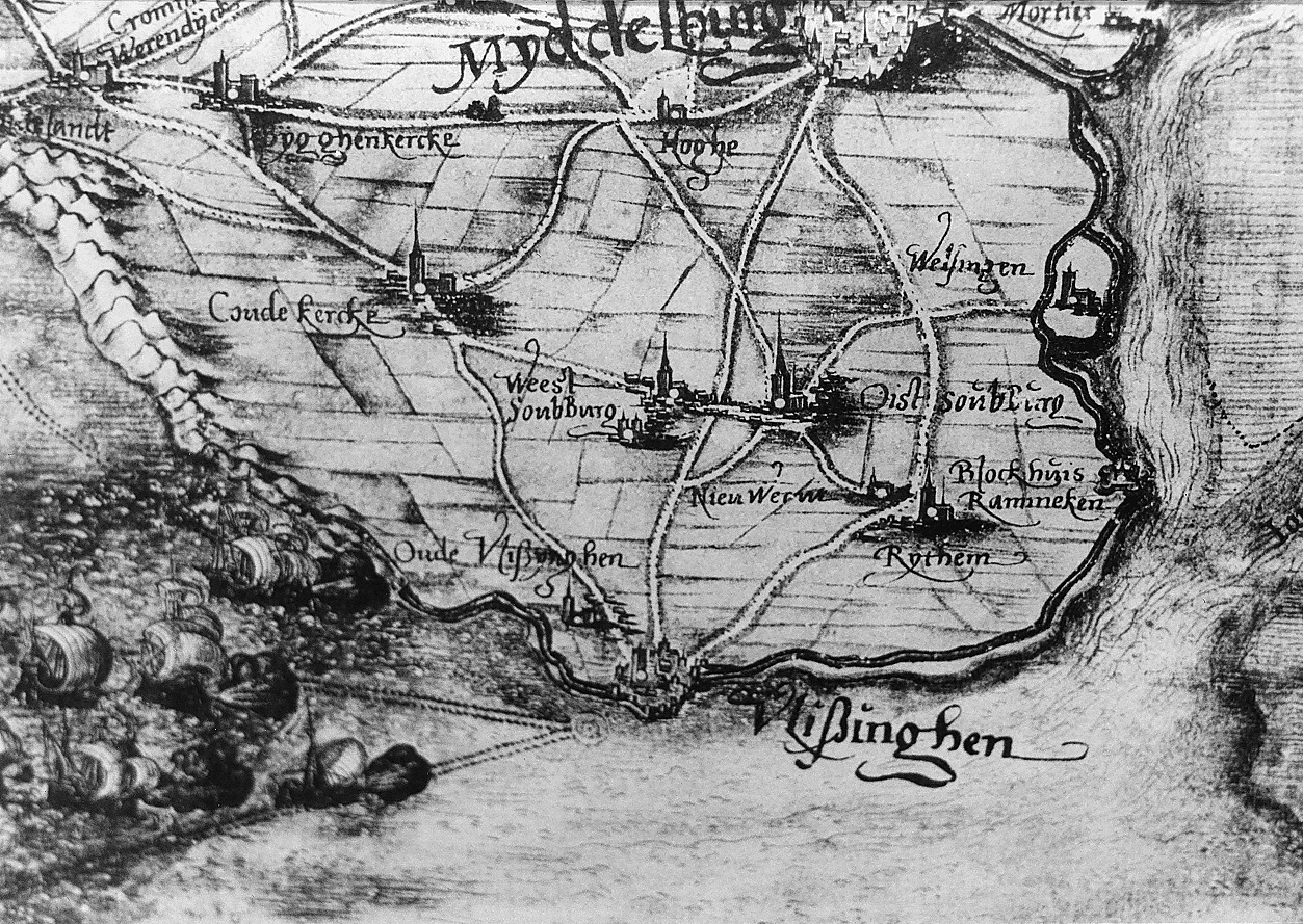 Fragment van de kaart van Christiaan sGrooten van Zeeland uit 1573 (Brusselse atlas; uitgave Fockema Andreae en Van 't Hoff, 1961) met daarop aangegeven de plaats'Weest Soubburg'.